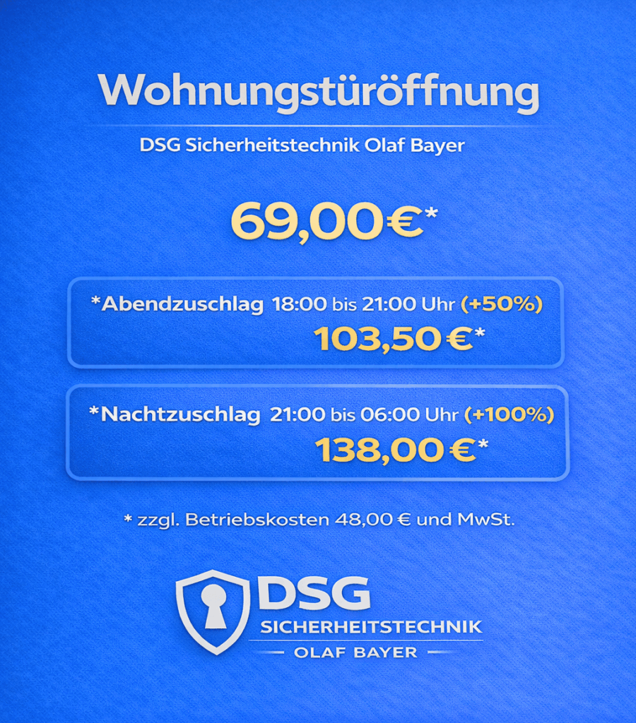 Nachts, am Wochenende oder an Feiertagen werden in der Regel Notdienstpauschalen fällig. Deshalb kostet ein Schlüsseldienst zu diesen Zeiten etwas mehr. Weiterhin ist es für eine genaue Preisauskunft am Telefon hilfreich, wenn der Sachverhalt möglichst exakt geschildert werden kann. Ist es eine Haus- oder Wohnungstüre und ist die Türe abgeschlossen oder lediglich zugefallen?